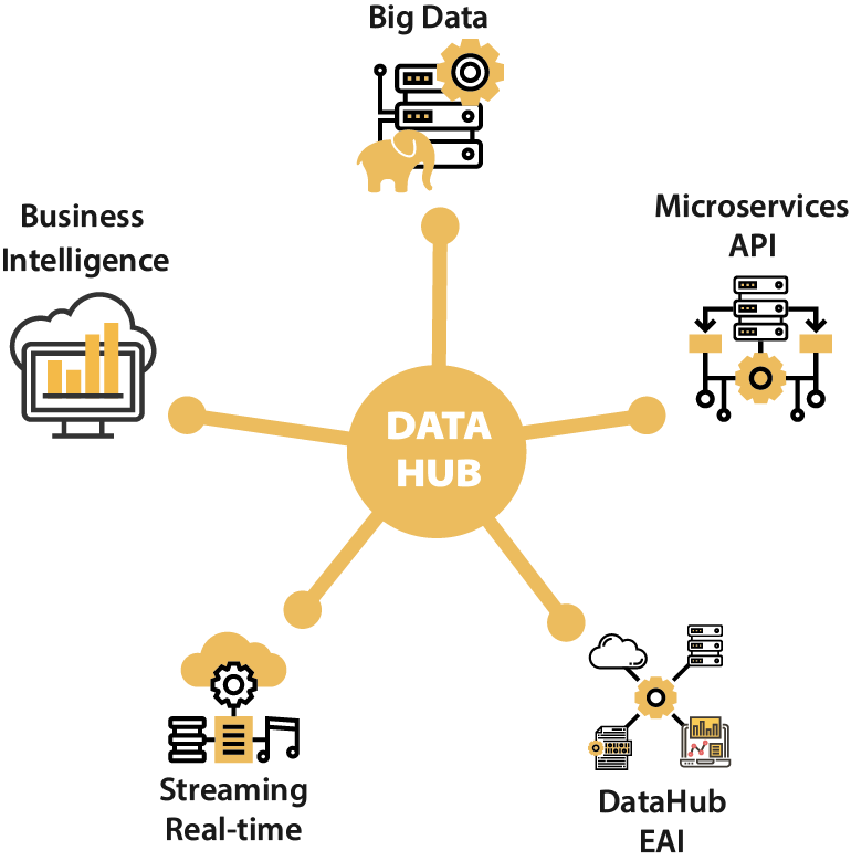 Data Hub: 데이터 허브는 다양한 데이터 원본으로부터 데이터를 수집, 변환, 조합하는 중앙 집중식 플랫폼입니다. 데이터 허브는 통합된 데이터 접근과 관리를 제공하며, 데이터 웨어하우스나 데이터 레이크와 비슷하지만 각각의 원본에서 데이터를 동기화하고 일관성을 유지하는 것에 더 중점을 둡니다.