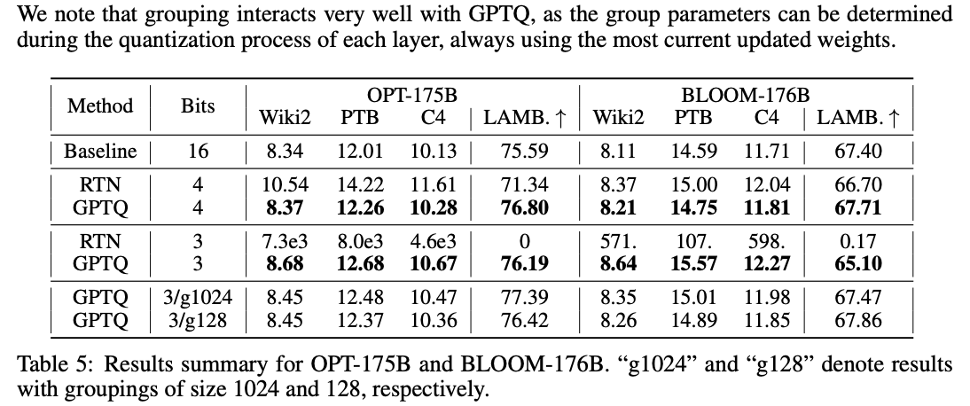 이 연구는 OPT와 BLOOM 알고리즘이 WikiText2 데이터셋에서 perplexity 결과를 제시하고 있습니다. BLOOM-176B와 OPT-175B는 가장 큰 밀집 모델로 알려져 있으며, GPTQ 모델의 4비트 성능은 전체 정밀도 버전보다 약간 낮은 퍼플렉서티를 보입니다. GPTQ의 정확도는 그룹화를 통해 개선될 수 있으며, OPT-66B 모델에는 압축이 어려워지는 문제가 있습니다. 또한, 이 논문은 OPT-175B와 BLOOM-176B에 대한 결과를 요약하고 실제적인 속도 향상에 대한 연구 결과를 제시합니다. 양자화된 모델은 적은 메모리를 사용하며, 동적으로 양자화 해제하여 실행할 수 있습니다. 또한, 언어 생성을 위해 양자화된 행렬-전체-정밀도-벡터-곱 커널을 개발하여 속도 향상을 이룰 수 있다는 것을 보여줍니다.