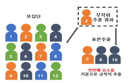 2.계통추출법 : 첫 번째 요소를 무작위로 선정한 후 목록의 매번 k번째 요소를 표본으로 선정하는 표집방법. K=N/n(N:모집단의 크기, n:표본의 크기, k:표집간격 ).