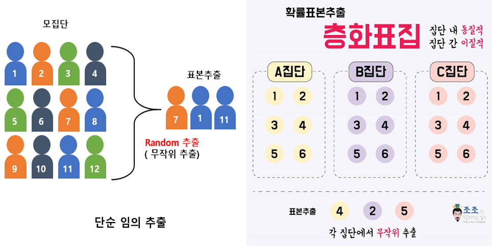 4.층화 추출법 : 모집단을 먼저 서로 겹치지 않는 여러 개의 층으로 분할한 후, 각 층에서 단순 임의추출법에 따라 배정된 표본을 추출하는 방법. ex) 연령, 학년
