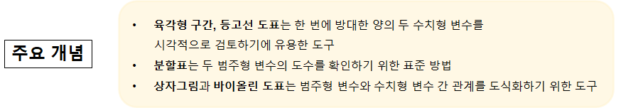 두 변수가 모두 범주형에 속할 때, 도수분포표를 2차원으로 확장한 형태로 요약할 수 있다.