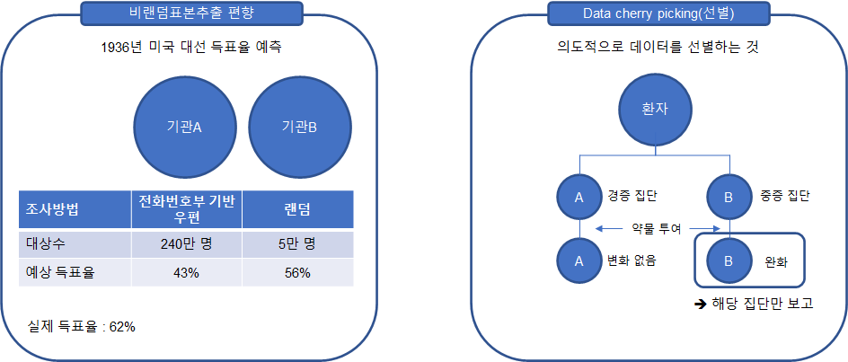 선택 편향 : 표본을 사전 또는 사후에 선택하게 되면서 통계 분석이 달라지는 현상