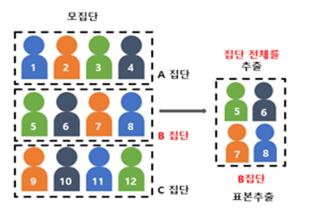 2.집락 추출법 : 먼저 집락을 추출, 추출된 집락 내의 일부 또는 전체를 조사하는 방법. 집락간에는 동질적, 집락 내에서는 이직적일 때 효율적. ex) 임의의 고등학교