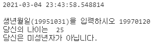 # 날짜의 입력은 # 특수하게 해석해서 년월일로 해석 import datetime dt = datetime.datetime.now() # 함수는 ()를 사용해야함 print(dt) print() #데이터입력 age = input("생년월일(19951031)을 입력하시오") #데이터처리 year = int(age[0:4]) # 마지막은 미포함 month = int(age[4:6]) day = int(age[6:]) # 빼기연산 # 분산 : 상계방지 (제곱) year_diff = dt.year - year month_diff = dt.month - month day_diff = dt.day - day if day_diff < 0: # 일 내림 month_diff -=1 if month_diff <0: # 월 내림 year_diff -=1 #데이터 출력 print("당신의 나이는 ", year_diff + 1) if year_diff < 18: print("당신은 미성년자입니다.") else: print("당신은 미성년자가 아닙니다.")