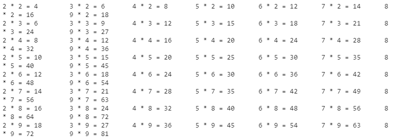 # 중첩된 for 문 for x in range(2,10): print() for y in range(2,10): print(y, '*', x, '=', x*y, '\t', end = " ")