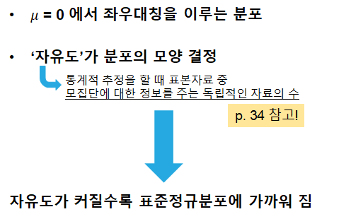 3. 분포의 모양을 결정하는 건 자유도이며, 자유도가 커질수록 표준정규분포에 가깝게 됨