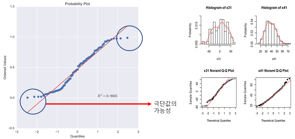 x축에는 Theoretical-Quantile 을, y축에는 획득된 샘플 값의 Empirical-Quantile (Z 점수) 을 표시
