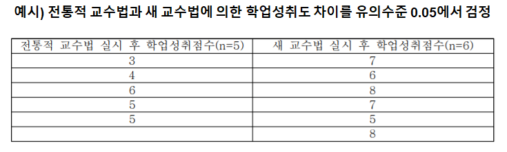 두 모집단으로부터 표본들을 독립적으로 추출하여 표본의 평균들을 비교함으로써 모집단의 유사성을 검정한다.