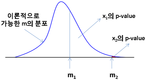 예) 실제로 가능한 m(평균)의 분포가 위와 같을 때, 내가 구한 평균이 m2 라면 p-value가 매우 작다.