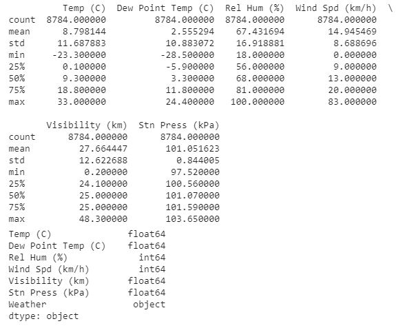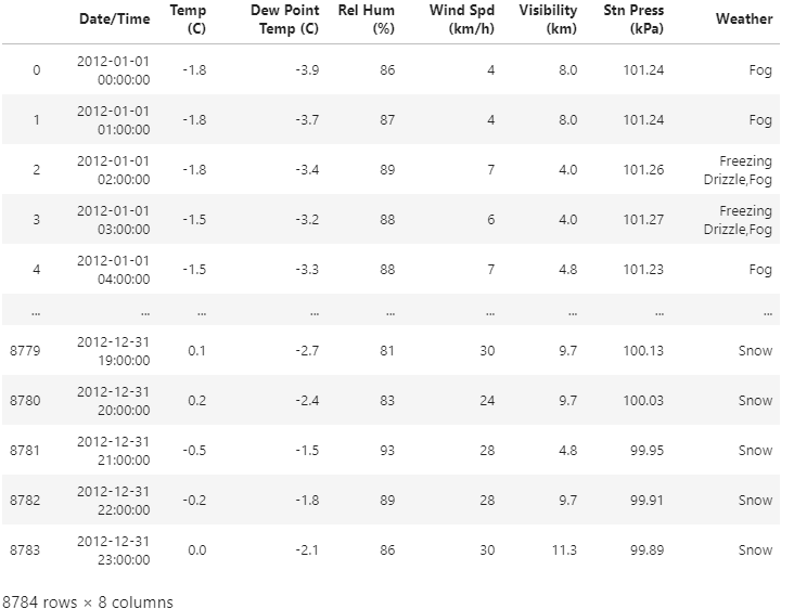 bigFilePath = "we_2012.csv" # 날짜 인덱스로 자동 변환해주고 # 대량의 데이터인 경우 chunksize chunker = pd.read_csv(bigFilePath, chunksize=1000, index_col="Date/Time", encoding="UTF-8") weather_2012_final = pd.concat([x for x in chunker], ignore_index=True)print(weather_2012_final.describe()) weather_2012_final.dtypes