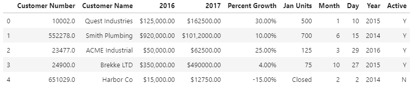 5. Y:1, N:0 으로 boolean형으로 변경# astype으로 형변환 진행(int형으로) df['Customer Number'] = df['Customer Number'].astype("int")df['2016'] = df['2016'].str.replace("$","") df['2016'] = df['2016'].str.replace(",","") df['2016'] = df['2016'].astype('float') df['2017'] = df['2017'].map(lambda x: x.replace("$","")) df['2017'] = df['2017'].map(lambda x :x.replace(",","")) df['2017'] = df['2017'].astype('float') #df['Percent Growth'] = df['Percent Growth'].str.replace("%","") def convert_percent(val): new_val = val.replace('%','') return float(new_val) / 100 df['Percent Growth'] = df['Percent Growth'].map(convert_percent)df['Active'] = df['Active'] == 'Y'df['Jan Units'] = pd.to_numeric(df['Jan Units'], errors='coerce') # ignore, raisedf.dtypesCustomer Number int32