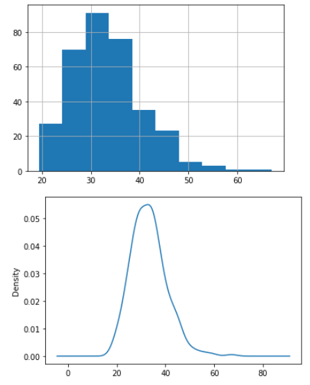 dtype: float64import matplotlib.pyplot as plt pim["bmi"].hist() # barplot(이산적) / histogram(부동소수점 float) plt.show() pim["bmi"].plot(kind="kde") # interpolation (보간법) plt.show()