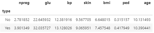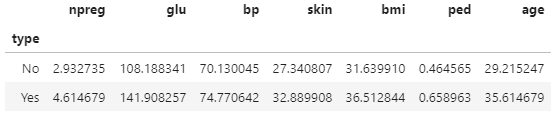group_by_type = pim.groupby("type") group_by_type.mean() group_by_type.std()