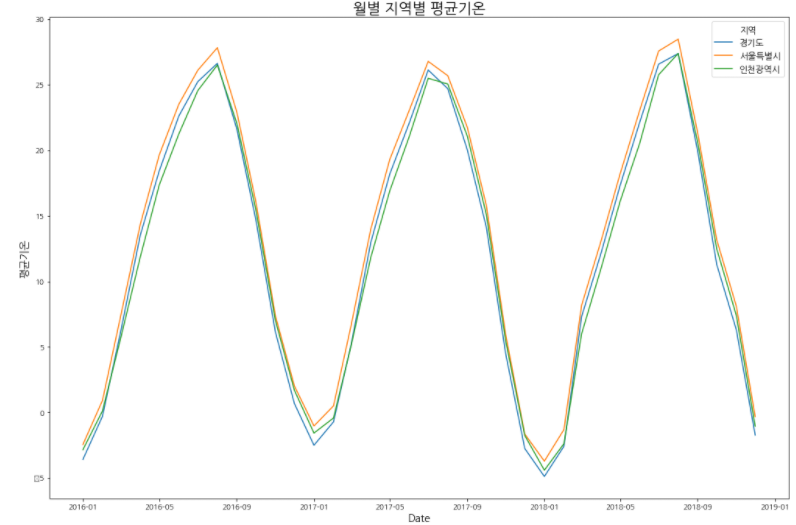 # 지역별 dictionary 생성 def area_slice(dataframe,area_list): area_dict = dict() for area in area_list: area_dict[area] = dataframe[dataframe['korea_cvs.bor_nm'] == area] return area_dictgyunggido_area = area_slice(gyunggido,gyunggido_area_list) seoul_area = area_slice(seoul,seoul_area_list) incheon_area = area_slice(incheon,incheon_area_list)temp = (gyunggido_area['광주시'][['korea_cvs.sale_dt(month)', '최고기온', '최대풍속', '최소기온', '평균기온', '평균풍속', '합계강수량']]).drop_duplicates('korea_cvs.sale_dt(month)')temp.index = temp['korea_cvs.sale_dt(month)']시각화 (지역별)