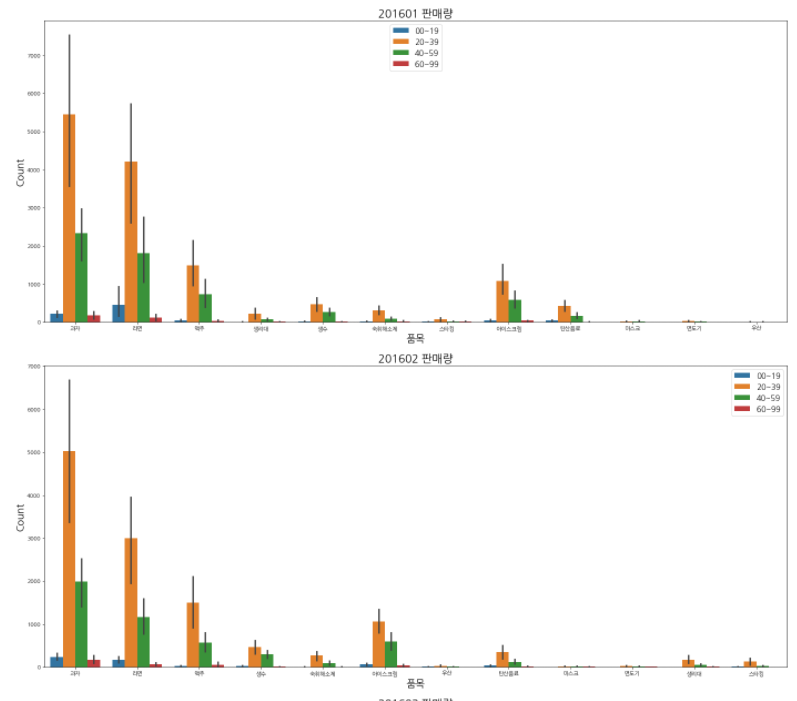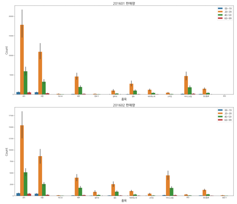 X는 품목명, Y는 Count, 나이대로 분류한 시각화 자료입니다.