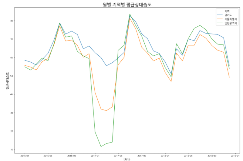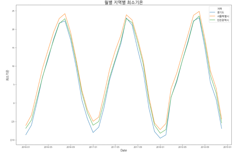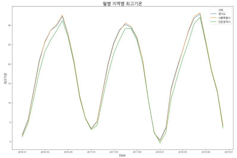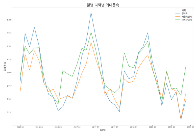 data_w['관측일'] = pd.to_datetime(data_w['관측일'],format="%Y%m%d")weather_col = ['최고기온','최대풍속','최소기온','평균기온', '평균상대습도','평균풍속', '합계강수량'] def whether_line_visualizition(data_w,weather_col,x='관측일',title=''): for col in weather_col: ax = sns.lineplot(x=x, y=col ,hue='지역',data=data_w) plt.title('{0} 지역별 {1}'.format(title,col), fontsize=20) plt.ylabel('{}'.format(col), fontsize=14) plt.xlabel('Date', fontsize=14) plt.legend(fontsize=12, loc='best') plt.show()