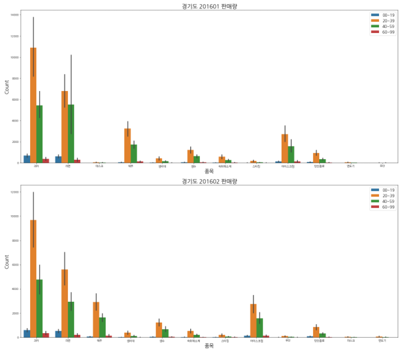 def visualization(dataframe,full_month, x='korea_cvs.category', y='korea_cvs.adj_qty', category=str('korea_cvs.gen_cd'), title=''): plt.rcParams['figure.figsize'] = [24, 10] for month, data in zip(full_month,dataframe): sns.barplot(x=x, y=y, hue=category, data=data,dodge=True) # default : dodge=True plt.ylabel('Count', fontsize=18) plt.xlabel('품목', fontsize=18) plt.title('{} {} 판매량'.format(title,month), fontsize=20) plt.legend(fontsize=14) plt.show()경기도, 서울, 인천 구역