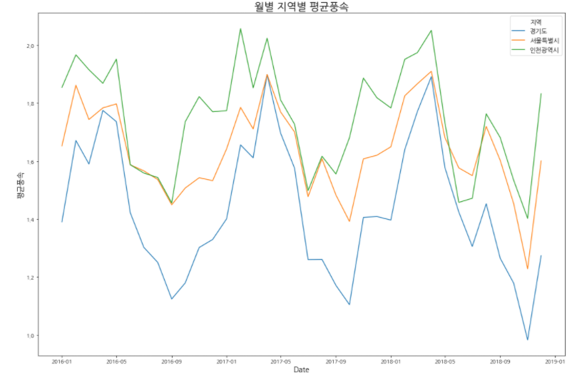 weather_col = ['최고기온','최대풍속','최소기온','평균기온', '평균상대습도','평균풍속', '합계강수량'] def whether_line_visualizition(data_w,weather_col,x='관측일',title=''): for col in weather_col: ax = sns.lineplot(x=x, y=col ,hue='지역',data=data_w) plt.title('{0} 지역별 {1}'.format(title,col), fontsize=20) plt.ylabel('{}'.format(col), fontsize=14) plt.xlabel('Date', fontsize=14) plt.legend(fontsize=12, loc='best') plt.show()