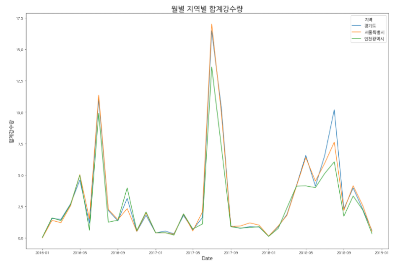 이 시각화 자료도 마찬가지로 경기도, 서울, 인천 지역으로 크게 나누어서 차이점을 확인하고 싶었습니다.