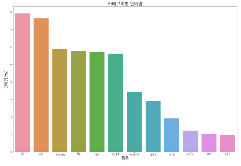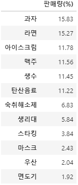 탄산음료 : 303774 비율 : 11.22 %category_df = pd.DataFrame([category_rank], index = ['판매량(%)']).Tcategory_df = category_df.sort_values('판매량(%)',ascending=False)category_df
