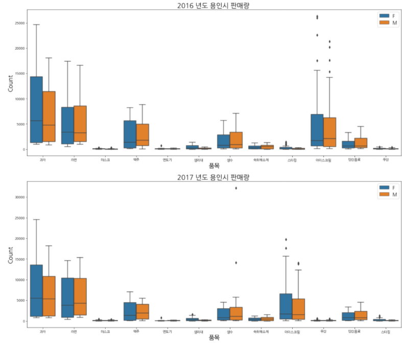 X는 품목별, Y는 Count, 분류를 성별로 나눠서 box plot으로 확인합니다.