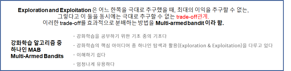 Exploitation : 최적의 방안을 얻고나서 이를 계속 채택하여 최대의 이익(reward)을 창출하는 것