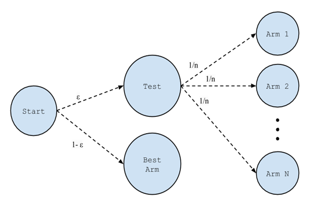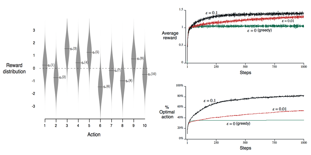 ε-greedy algorithm : 항상 경험적 평균값을 기준으로 1-ε 확률 로 reward가 좋은 action을 고르고