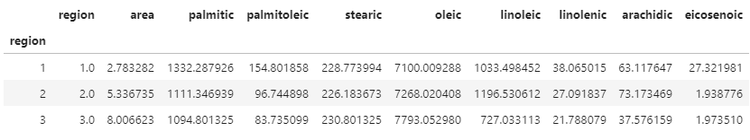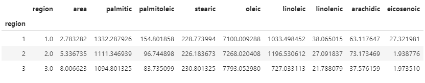 region_groupby =df.groupby(['region']) region_groupby.mean() # 다른방법 apply 사용(1) region_groupby.apply(np.mean) # 함수의 주소를 넘겨줌 # 참고 : 여러 함수 적용 시 aggFunc