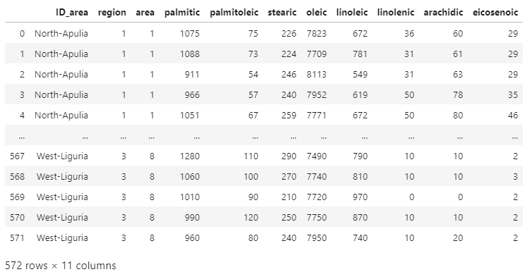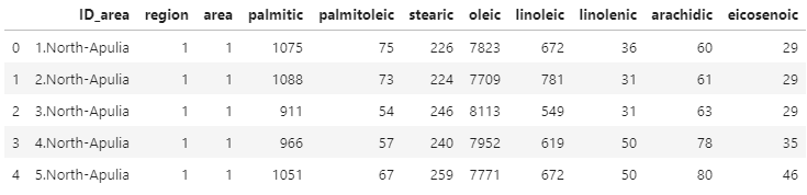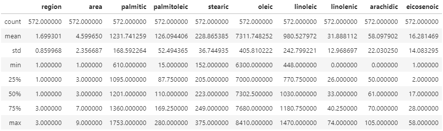 path ="./olive.csv" df = pd.read_csv(path) df.head(5) # 기본 3형제, 데이터만 보면 자동으로 나와야 함 print(df.dtypes) df.describe()Unnamed: 0 object