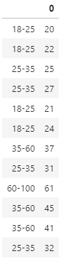 import pandas as pd import numpy as np from numpy import array # 다음 데이터를 18~25, 25~35, 35~60, 60~100 사이의 값으로 범주화하시오 # 나으 풀이 ages = [20,22,25,27,21,24,37,31,61,45,41,32] labels = ['18-25', '25-35', '35-60', '60-100'] range_list = [18, 25, 35, 60, 100] age_group = pd.cut(ages, range_list, right=False, labels=labels) # default는 true (right 값이 포함) age_group df = DataFrame(ages, age_group) df