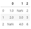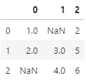 import pandas as pd import numpy as np df = pd.DataFrame([[1, np.nan, 2],[2,3,5],[np.nan,4,6]]) df