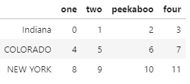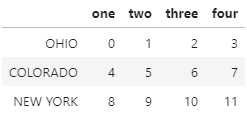 # 문제 data = DataFrame(np.arange(12).reshape((3,4)), index=['Ohio','Colorado','New York'], columns=['one','two','three','four'])# index의 단어를 모두 대문자로 변경하시오 data.index = data.index.str.upper()data.index = data.index.map(str.upper) data