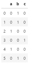 # 원핫인코딩 : 선형회귀에서 범주형 변수는 반드시 실행 # 연속형 + 범주형 df = pd.DataFrame({'key':['b','b','a','c','a','b'], 'data1':range(6)}) pd.get_dummies(df['key'])