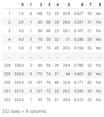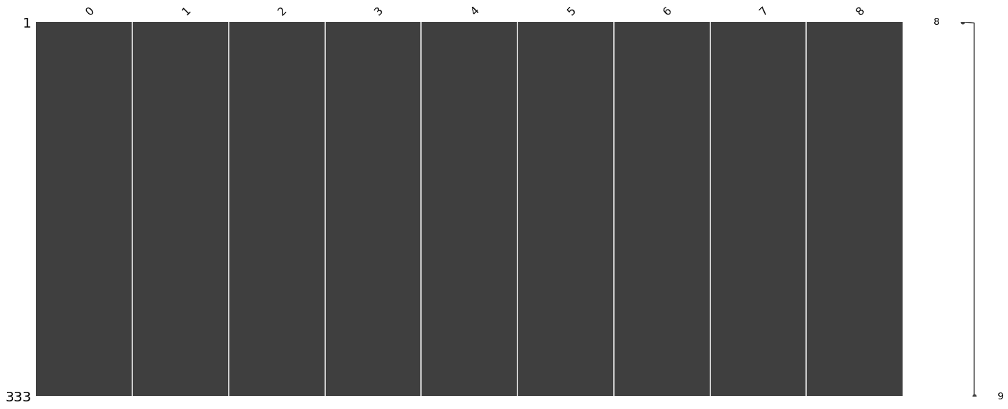 dtype: float64import missingno as msno import matplotlib.pyplot as plt import pandas as pd df = pd.read_csv('diab.csv', header=None) msno.matrix(df) plt.show()