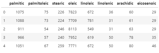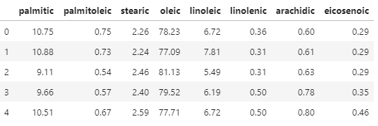 'linoenic', 'arachidic', 'eicosenoic'의 컬럼만 추려서 별도의 sub데이터 프레임(변수이름 dfsub)을 생성하시오.acidlist = ['palmitic', 'palmitoleic', 'stearic', 'oleic', 'linoleic', 'linolenic', 'arachidic', 'eicosenoic'] dfsub = df[acidlist] dfsub.head()