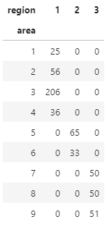df.region.unique() df.area.unique() # crosstab : 교차분석표 pd.crosstab(df.area, df.region)