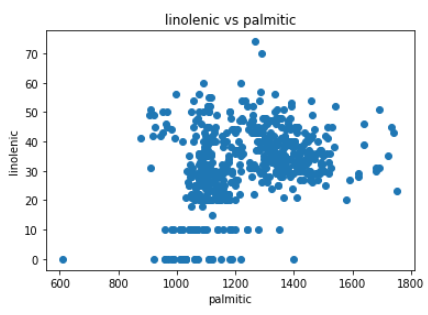 fig = plt.figure() plt.scatter(df['palmitic'], df['linolenic']) axis = fig.gca() axis.set_title('linolenic vs palmitic') axis.set_xlabel('palmitic') axis.set_ylabel('linolenic')Text(0, 0.5, 'linolenic')