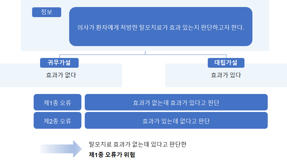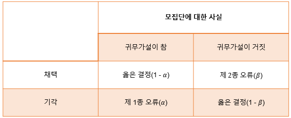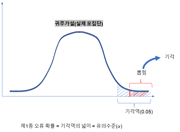 제 1종 오류 : 귀무가설이 참인데 기각하는 것