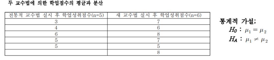 예시) 전통적 교수법과 새 교수법에 의한 학업성취도 차이를 유의수준 0.05에서 검정