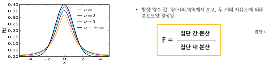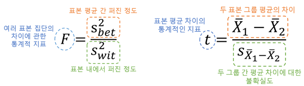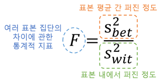 예) 분모 : 두 표본그룹의 평균간 차이의 불확실도 -> F- value : 표본 내에서 퍼진 정도