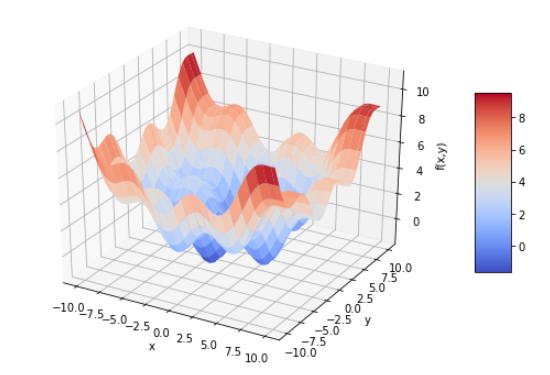 import matplotlib as mpl from mpl_toolkits.mplot3d import Axes3D def fm(p): x,y = p return (np.sin(x) + 0.05 * x ** 2 + np.sin(y) + 0.05 * y **2) x= np.linspace(-10,10,50) y= np.linspace(-10,10,50) X,Y = np.meshgrid(x,y) Z =fm((X,Y)) fig = plt.figure(figsize=(9,6)) ax= fig.gca(projection='3d') surf = ax.plot_surface(X,Y,Z,rstride=2,cstride=2,cmap=mpl.cm.coolwarm, linewidth=0.5,antialiased=True) ax.set_xlabel('x') ax.set_ylabel('y') ax.set_zlabel('f(x,y)') fig.colorbar(surf, shrink=0.5,aspect=5) # 모멘텀은 가던방향으로 진동을 더줘서 타고 내려가게끔 # GD : Gradient descent : 경사하강법 => ANN (Artificial neural network) # 지역해 문제 -> momentum # fitting 시간 문제 : 학습율 문제 : 처음은 많이 점점 작게 # Adam optimizer