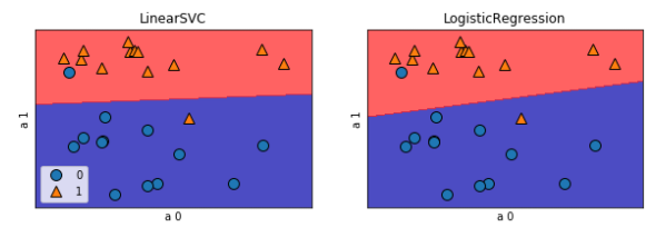 from sklearn.linear_model import LogisticRegression from sklearn.svm import LinearSVC import mglearn X, y = mglearn.datasets.make_forge() fig, axes = plt.subplots(1,2,figsize=(10,3)) # axes 도화지. # Support vector classifier 서포트 벡터로 생성된 분류기 # ANN이 최적화된놈 SVC(분류) # zip하면 두개를 묶어줌 for model, ax in zip([LinearSVC(),LogisticRegression()], axes): # 도화지한장은 SVC 한장은 로지스틱 clf = model.fit(X,y) # 계수를 만듦 mglearn.plots.plot_2d_separator(clf, X, fill=True, eps = 0.5, ax=ax, alpha = .7) # alpha 투명도 mglearn.discrete_scatter(X[:,0], X[:,1],y, ax =ax) ax.set_title("{}".format(clf.__class__.__name__)) ax.set_xlabel("특성 0") ax.set_ylabel("특성 1") axes[0].legend()