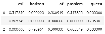 from sklearn.feature_extraction.text import TfidfVectorizer vec = TfidfVectorizer() # Term frequency(단어빈도) + inverse document frequency(역문서빈도) # 단어수 / 전체문서 => 전체문서/단어수 # 잘등장하지 않는 단어에다가 가산점을 줘서 계산. X = vec.fit_transform(sample) pd.DataFrame(X.toarray(),columns=vec.get_feature_names())
