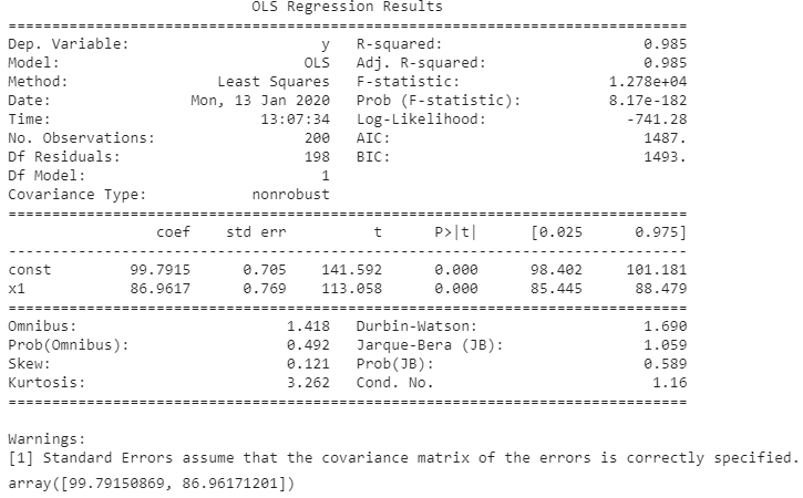 from sklearn.datasets import make_regression import statsmodels.api as sm bias = 100 # 절편 # 속성 # 계수 : 기울기 X0, y, w = make_regression(n_samples=200, n_features=1, bias=bias, noise =10, coef=True,random_state=1) print(X0[:5,:]) # 선형회귀시 범주형은 상수로 등록 statsmodels 에서 회귀 분석시 # 상수별로 회귀분석을 실행 X = sm.add_constant(X0) # 상수항을 고려해라 ( 절편을 고려해라 ) print(X[:5,:]) y= y.reshape(len(y),1) print(w) # 86.44[[ 0.23249456]