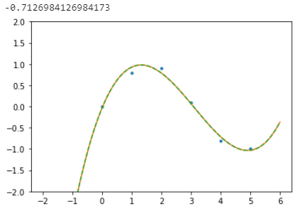 p30= np.poly1d(np.polyfit(x,y,3)) # 방정식으로 변환해줌 print(p30(4)) # 방정식으로 구한 값을 리턴 xp = np.linspace(-2,6,100) # 100등분 -2부터 6까지 _ = plt.plot(x,y,'.',xp,p(xp),'-',xp,p30(xp),'--') plt.ylim(-2,2) plt.show()