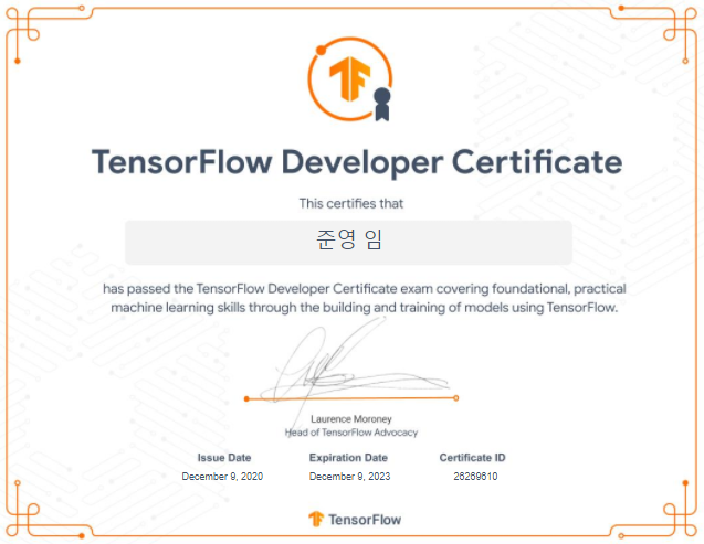 Tensorflow Certificate 시험준비 과정 및 합격 후기자격증 2020. 12. 10. 09:32반응형
