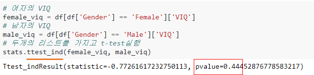 Q. 여자의 VIQ와 남자의 VIQ의 평균은 통계적으로 차이가 있는지