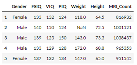 총 40명의 사람들의 성별, IQ, 몸무게, 키 그리고 MRI_count