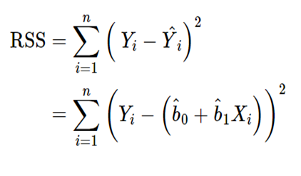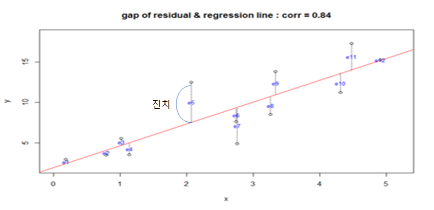 •회귀선(regression line): 잔차들을 제곱한 값들의 합인 잔차제곱합(RSS; Residual Sum of Square)을 최소로 하는 선