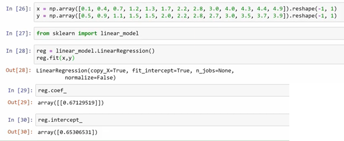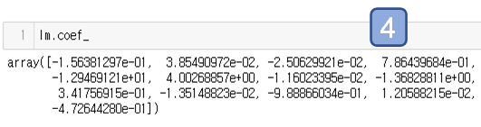 여기서 결과값으로 나온 coef_는 계수(coefficient) 즉 기울기 입니다.
